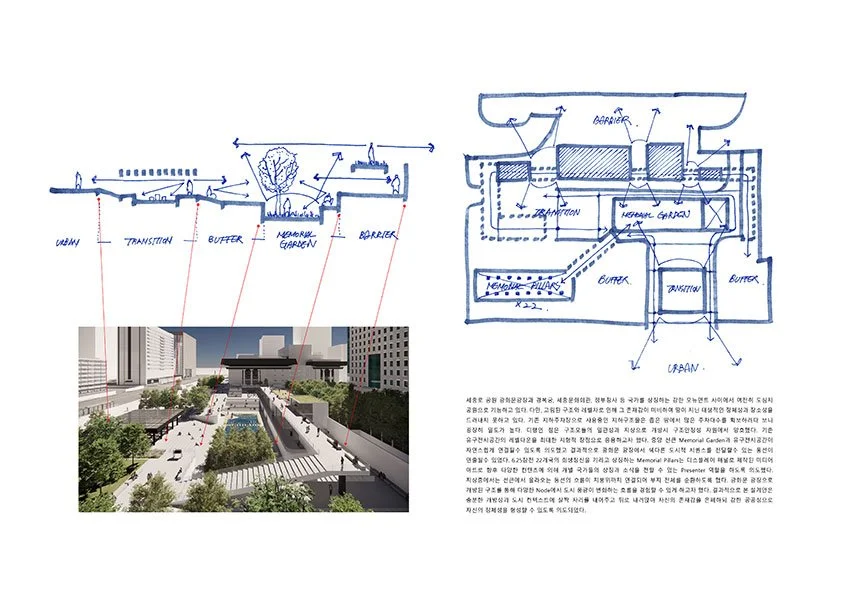 세종로 공원 광화문광장과 경복궁, 세종문화회관, 정부청사 등 국가를 상징하는 강한 모뉴먼트 사이에서 여전히 도심지 공원으로 기능하고 있다. 다만, 고림된 구조와 레벨차로 인해 그 존재감이 미비하여 땅이 지닌 태생적인 정체성과 장소성을 드러내지 못하고 있다. 기존 지하주차장으로 사용중인 지하구조물은 좁은 땅에서 많은 주차대수를 확보하려다 보니 굉장히 밀도가 높다. 디행인 점은 구조모듈의 일관성과 지상으로 개방시 구조안정성 차원에서 양호했다. 기존 유구전시공간의 레벨다운을 최대한 지형적 장점으로 응용하고자 했다. 중앙 선큰 Memorial Garden과 유구전시공간이 자연스럽게 연결될수 있도록 의도했고 결과적으로 광화문 광장에서 색다른 도시적 시퀀스를 전달할수 있는 동선이 연출될수 있었다. 6.25참전 22개국의 희생정신을 기리고 상징하는 Memorial Pillars는 디스플레이 패널로 제작된 미디어 아트로 향후 다양한 컨텐츠에 의해 개별 국가들의 상징과 소식을 전할 수 있는 Presenter 역할을 하도록 의도했다. 지상층에서는 선큰에서 올라오는 동선의 흐름이 지붕위까지 연결되어 부지 전체를 순환하도록 했다. 광화문 광장으로 개방된 구조를 통해 다양한 Node에서 도시 풍광이 변화하는 흐름을 경험할 수 있게 하고자 했다. 결과적으로 본 설계안은 충분한 개방성과 도시 컨텍스트에 살짝 자리를 내어주고 뒤로 내려앉아 자신의 존재감을 은폐하되 강한 공공성으로 자신의 정체성을 형성할 수 있도록 의도되었다. Seoul Memorial Garden은 크게 5개의 공간으로 구성된다. 기존 세종로 공원 지하1층의 상부 슬라브를 개방하여 마련한 선큰공원에는 수공간과 함께 복층형의 정원인 Seoul Memorial Garden(서울 기억의 정원)이 중심을 잡고, 그 주변으로 22개 6.25참전국의 희생을 상징하는 Memorial Pillars(기억의 필러)와 2방향에서 접근 가능한 계단광장이 연결된다. 기존의 유구전시공간은 일부 벽체를 해체하여 지하1층의 Seoul Memorial Garden과 직접연결하여 레벨차를 능동적으로 활용했다. 지하공간이나 상부 하늘로 개방된 방식을 통해 도심지 내에서 상징공간의 의미와 공간감을 느낄수 있도록 의도했다. 특히 Seoul Memorial Garden과 Memorial Pillars는 긴 연결통로를 지나 공간이 확장되는 요소를 적용해 상징성이 극대화 될 수 있도록 했다. 무엇보다 입체적이고 다채로운 공간구성은 방문객들로 하여금 다양한 공간체험과 새로운 기억을 안겨줌으로써 ‘기억의 정원’의 연속성을 지속시켜나갈 것이다.ㅤ